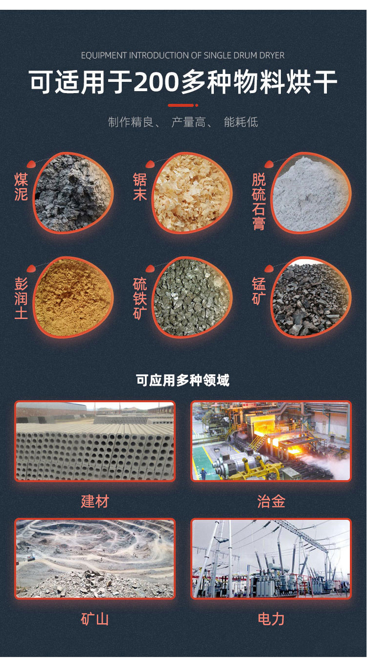 單筒烘干機(jī)系統(tǒng)是由熱源、打散裝置、帶式上料機(jī)、進(jìn)料機(jī)、回轉(zhuǎn)滾筒、帶式出料機(jī)、引風(fēng)機(jī)、卸料器和配電柜構(gòu)成的新型專用干燥設(shè)備,可廣泛應(yīng)用于煤泥、原煤、浮選精煤、混合精煤等煤炭行業(yè)物料的干燥;高爐礦渣、粘土、澎潤土、石灰石、沙子、石英石等建筑行業(yè)物料的干燥;各種金屬精礦、廢渣、尾礦等選礦行業(yè)物料的干燥;以及化工行業(yè)非熱敏性物料的干燥。